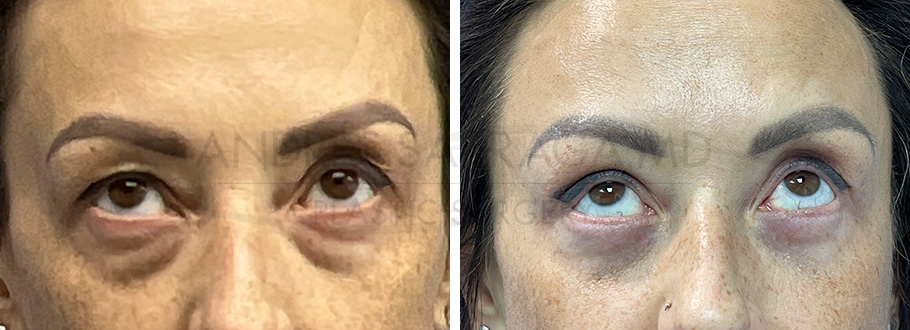Young middle-aged female who felt her eyelids were heavy and uneven; underwent an upper and lower lid custom blepharoplasty with fat transposition and laser resurfacing. the change is dramatic and brings her eyes back to balance in a pleasing and elegant manner. Her smile tells the rest of the story.