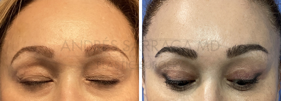 Young middle aged female who underwent a S.I.M.P.L.E. eye lift with an internal tuck. She is shown 7 months later with no signs of eye heaviness and a beautiful contour of the brow. All through one hidden incision.