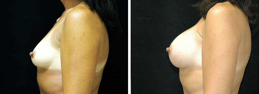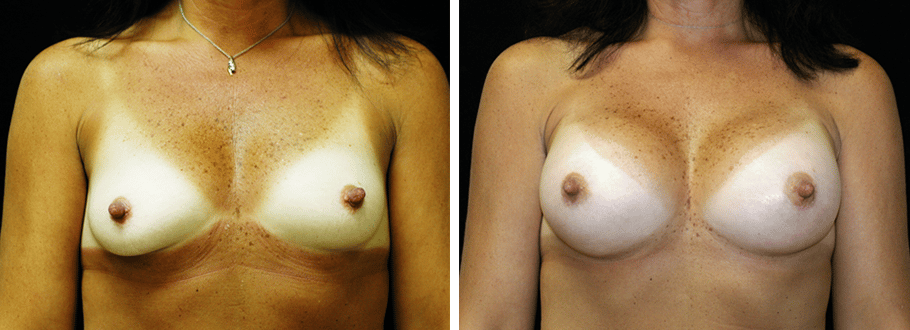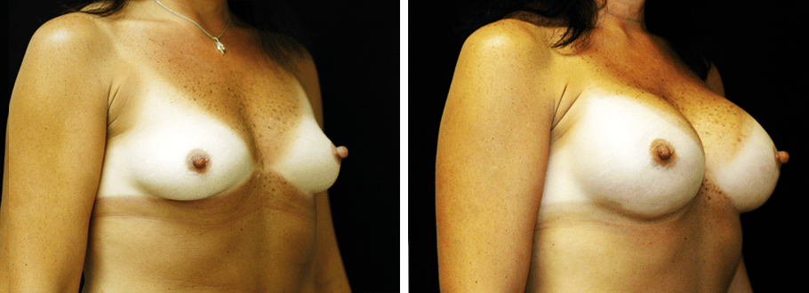 47 year old female with post pregnancy breast loss of breast volumeand mild sagging of the breasts.Patient desired breast reshaping and enlargement 390 CC implants – subpectoral (submuscular). Placed through incision at lower margin of nipple areolar area . (periareolar incision).