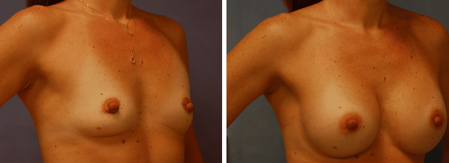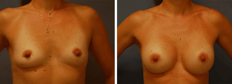 38 y/o female who post pregnancy presented with deflated breasts with breast tissue atrophy. She underwent a silicone breast augmentation with 371ml smooth round implants with an incision through the nipple. She is shown 1 year after surgery.