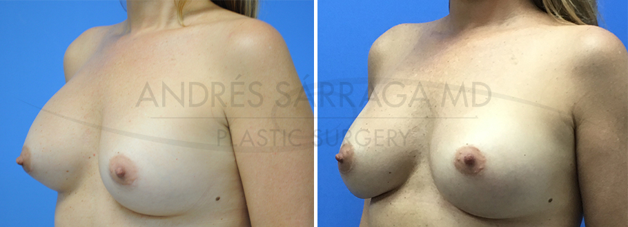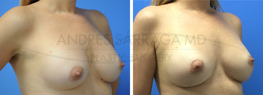 Female in her mid 30’s with prior breast augmentation elsewhere who presented with a right breast capsular contracture (scar around the implant); shown after removal and replacement scar removal and change to cohesive silicone implants with slight size enhancement.