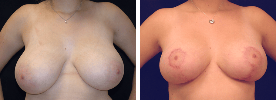18 year old female complains of heavy, pendulous breasts. Complains breasts are also too low. Heaviness of her breasts causing significant discomfort and limitation of activities. following breast lift, and breast reduction of approximately 500 grams if tissue from each breast. Patient seen 8 weeks following the surgery. Incisions are still quite pink, but will fade slowly over time. Patient MUCH more comfortable, and very happy with the results of her procedure.