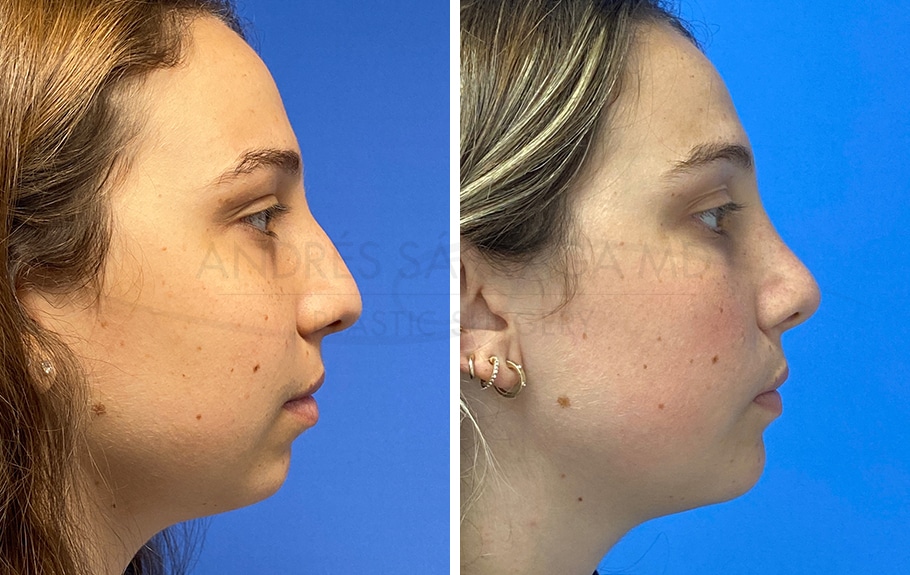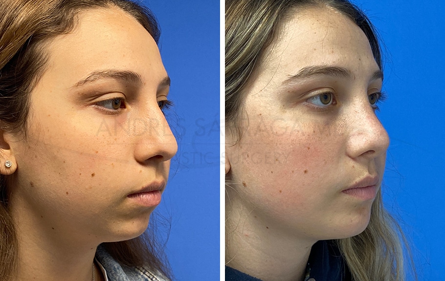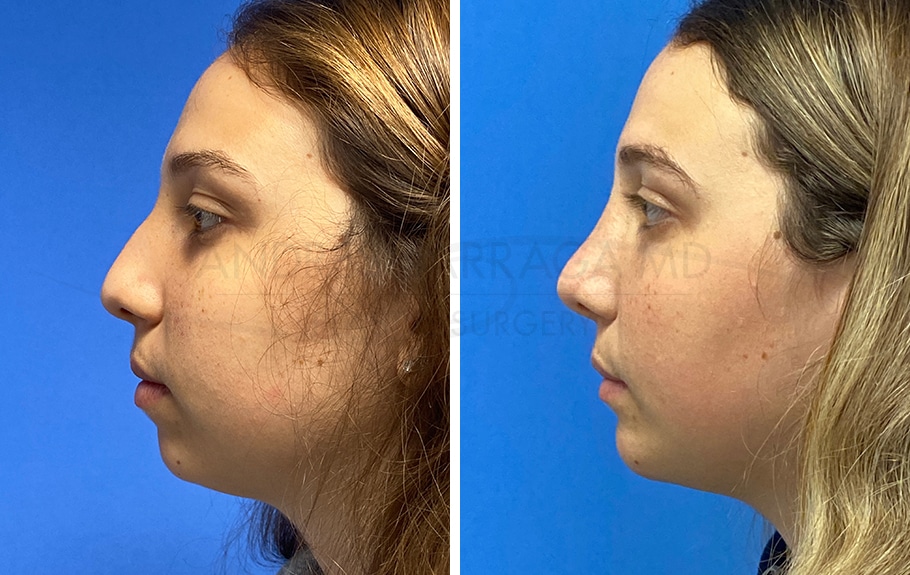 Young female who felt her nose was too full and heavy. There are no visible incisions and the profile (side) view looks balanced with her other pretty features.