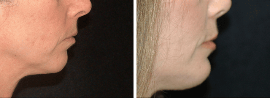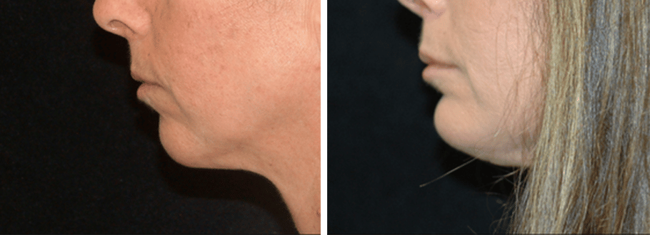 Chin implant with secondary rhinoplasty: 45 year old patient had previous rhinoplasty done 25 years ago by another surgeon elsewhere. She now presents with complaints of not liking her profile and feeling that her chin is somewhat too small or receding. she also complains of constant nasal airway congestion and obstruction as well not liking the appearance of her nose, especially on her profile view. Patient also complains of obvious “puffiness” under her eyes, and “extra skin” in the upper eyelid area. The patient is then seen pre-op, and then 3 months after having undergone a chin implant procedure, as well as a secondary, or revisionary rhinoplasty. The patient also underwent an upper and lower eyelid blepharoplasty.