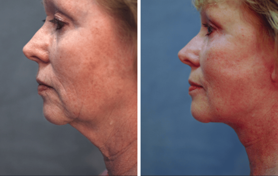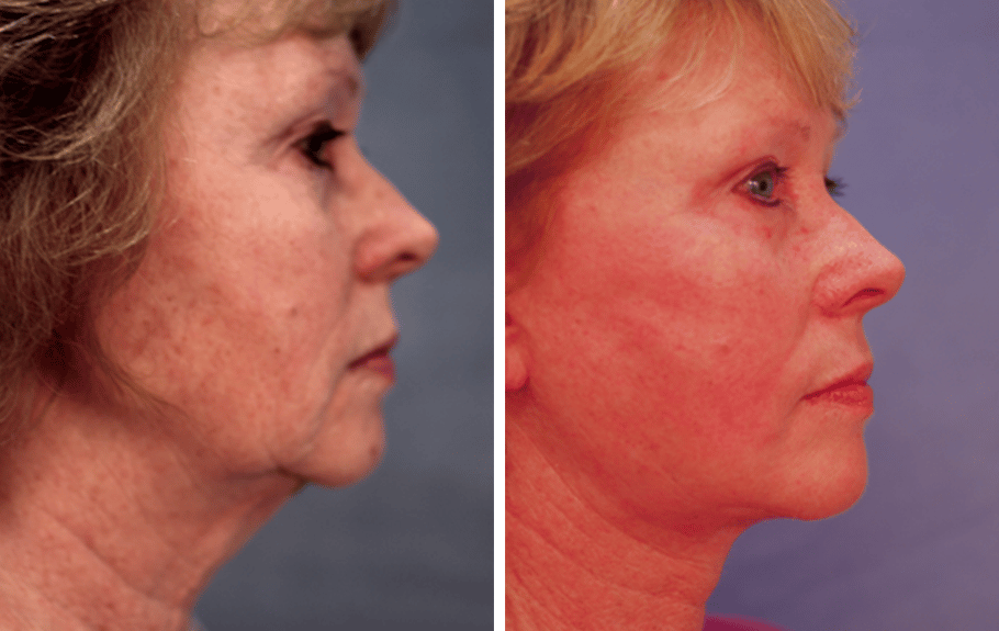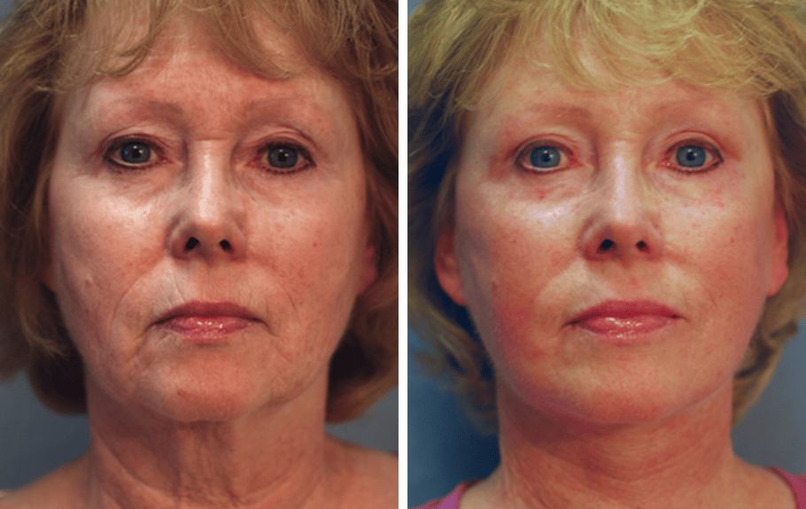 59 year old female presents with complaints of looseness and wrinkling, especially in her neck and jawline areas. She also doesn’t like the wrinkling and lines around her mouth, and also complains about the “extra skin” in her upper eyelid areas. Patient is seen pre-op, and then 6 months post-op. She has undergone a Neck and Facelift, along with an upper eyelid blepharoplasty. She also has had a Carbon Dioxide Laser resurfacing procedure to the area around her mouth. These procedures were done as combined procedures during a single operative session.