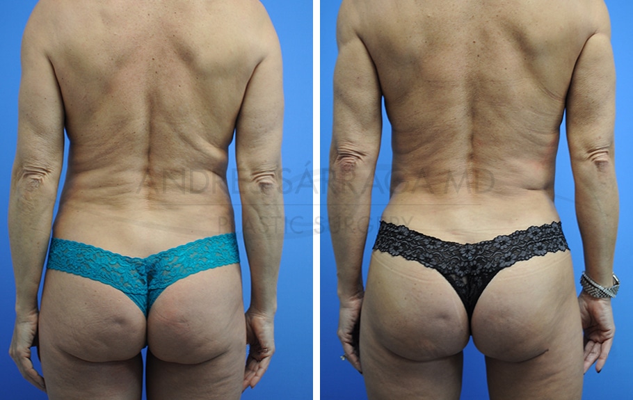 Shown after liposcultpture of back, arms, thighs and fat transfer to the buttocks area.