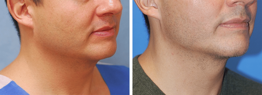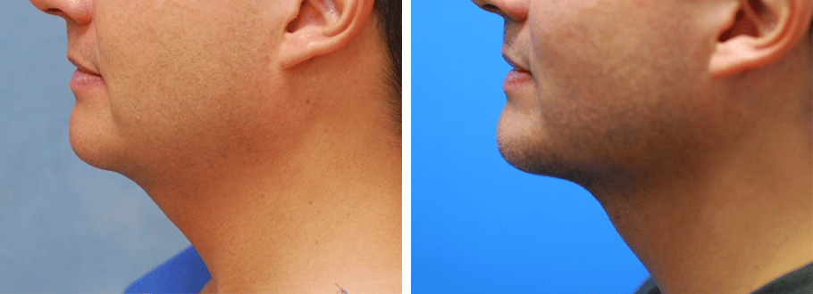 Male patient early forties who felt his jaw line and neck had excess fullness and poor definition. He is shown after combined treatment with Ultherapy to the lower face and Kybella to the submental area.