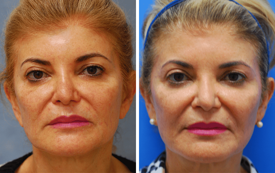 Female patient who desired a rejuvenated look to her face without surgery. She is shown 10 months after full face treatment with Ultherapy and targeted fillers for volumization using Restylane and Voluma.