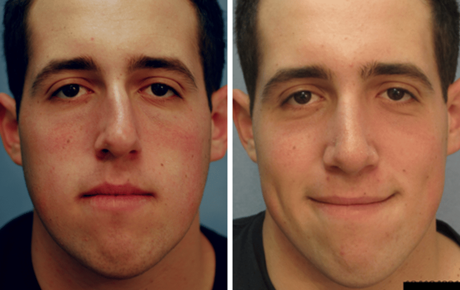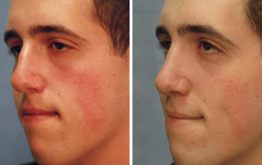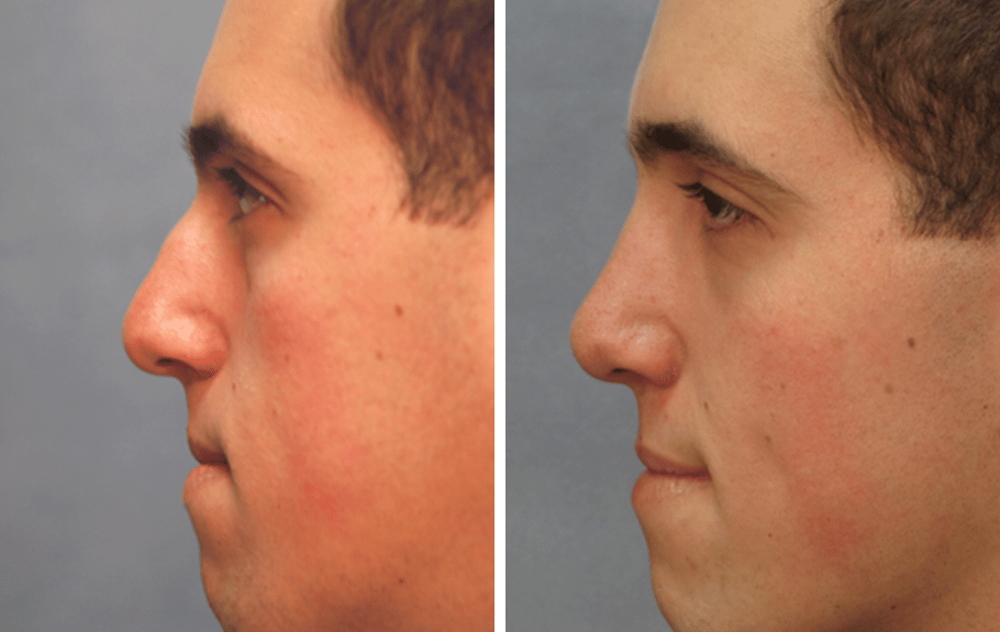 22 year old male complains of nasal deviation and deformity resulting from numerous sports injuries. Patient also complains of severe nasal congestion and difficulty breathing through his nose. Following a rhinoplasty, with treatment of the internal septum and turbinates, the patient is seen with a straightened nose, and also a much improved nasal airway and nasal breathing.